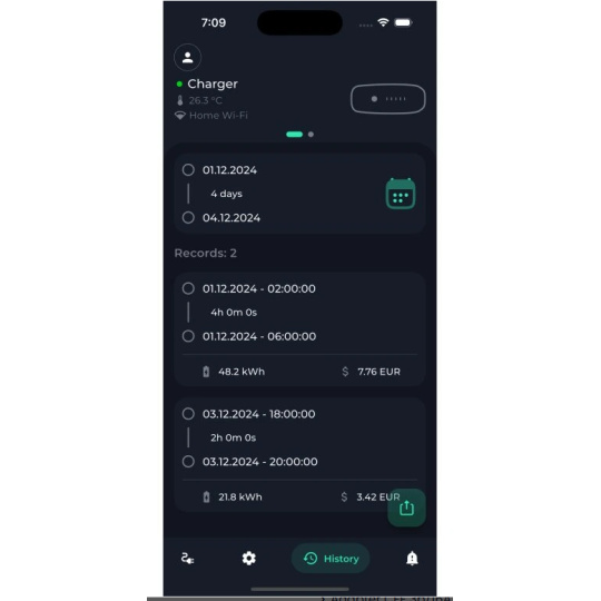 - nastavení částky za kWh a měny pro součet hodnot v historii nabíjení