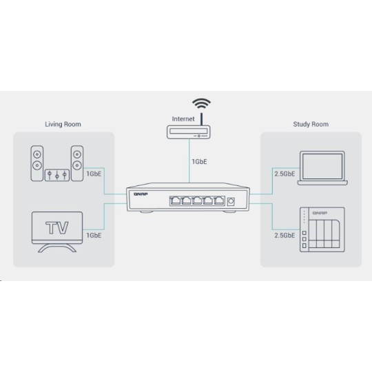 S pěti porty 2,5GbE switch QNAP QSW-1105-5T okamžitě upgraduje vaši síť tak, aby mohla využívat výhody zařízení podporujících 2,5GbE a NAS, aniž by byly nutné jakékoli nové síťové kabely. Zařízení QSW-1105-5T nabízí téměř tiché provedení bez ventilátoru a zapojení typu plug-and-play. Funkce detekce a blokování síťové smyčky umožňuje snadné vytvoření dostupného vysokorychlostního síťového prostředí pro váš domov nebo podnik.
