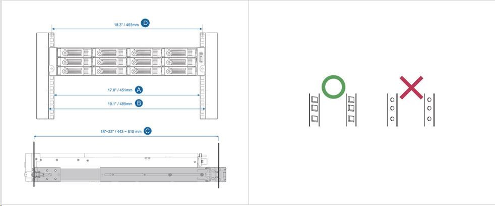 - Vzdálenost mezi dvěma rackovými sloupky (měření čtvercových otvorů racku střed-střed) je 18,3"(465 mm)