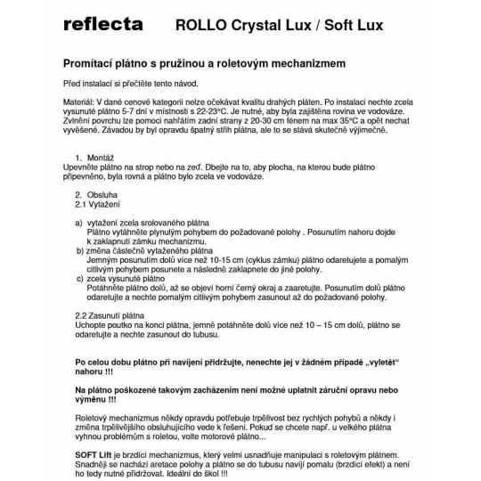 Roletové plátno ROLLO CrystalLine 180x141cm, viditelná plocha 176x99cm, 16:9, 80"/202cm, bílý hranatý kovový tubus 7x195cm/7kg, uchycení na stěnu nebo strop, materiál BetaLux - bílá 0,35 tkanina 300g/m2 s 2cm černým okrajem a zadní stranou, Gain=1,0, pozorovací úhel 120°. Lux - bílý matný povrch pro maximálně věrný a kontrastní obraz při alespoň částečném zatemnění. PVC materiál s textilním základem vytváří rovnou plochu bez zvlnění ale v krajích může docházet k prohnutí - postupně mizí. Snadné uchycení 4 vruty na plastových bocích plátna - stěna nebo strop. Možnost aretace polohy plátna při každé otáčce mechanizmu. Pozor při zpětném navíjení plátna je nutné plátno přidržovat - nesmí dojít k rychlému navinutí, které při nárazu na tubus může poškodit vnitřní mechanizmus bez možnosti uplatnění záruční doby..