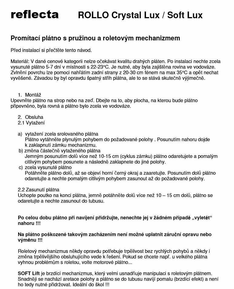 Roletové plátno ROLLO CrystalLine 180x144cm, viditelná plocha 176x132cm, 4:3, 87"/220cm, bílý hranatý kovový tubus 7x195cm/7kg, uchycení na stěnu nebo strop, materiál BetaLux - bílá 0,35 tkanina 300g/m2 s 2cm černým okrajem a zadní stranou, Gain=1,0, pozorovací úhel 120°. Lux - bílý matný povrch pro maximálně věrný a kontrastní obraz při alespoň částečném zatemnění. PVC materiál s textilním základem vytváří rovnou plochu bez zvlnění ale v krajích může docházet k prohnutí - postupně mizí. Snadné uchycení 4 vruty na plastových bocích plátna - stěna nebo strop. Možnost aretace polohy plátna při každé otáčce mechanizmu. Pozor při zpětném navíjení plátna je nutné plátno přidržovat - nesmí dojít k rychlému navinutí, které při nárazu na tubus může poškodit vnitřní mechanizmus bez možnosti uplatnění záruční doby..