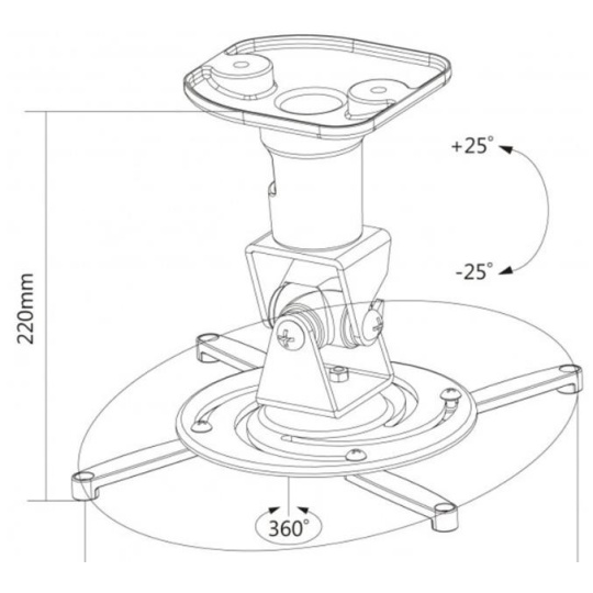 Stropní držák na dataprojektory - vzdálenost od stropu 22cm, přístroj lze otočit o 360° a naklonit +/-25°, maximální zatížení 15kg, kabelový prostup, vhodné i pro uchycení na šikmé plochy, bílý. Univerzální systém uchycení dataprojektorů (rozsah 18-31 cm)..
