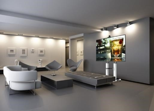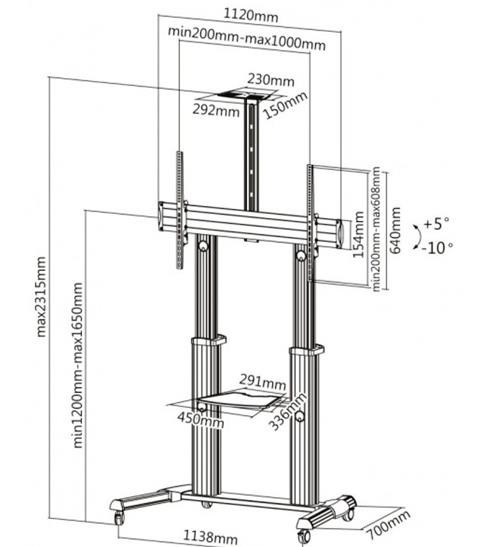 Moderní televizní stolek na Plasma a LCD TV s uhlopříčkou 60"- 100" (152-254cm) a hmotností maximálně 100kg. 2x teleskopická nosná tyč na kolečkách, držák otočný o 90° a vertikálně výklopný +5°/-10°, horní výškově nastavitelná plocha pro kameru, polička, AluDesign, barva stříbrná. Uchycení VESA: 200x200, 300x300, 400x200, 400x400, 600x400, 800x400, 800x600, 1000x600..