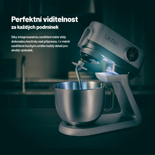 Kuchyňský robot Lauben Kitchen Machine 1300SG vyniká nejen praktičností, ale také vzhledem. Jeho prémiový design se stane ozdobou každé kuchyně. Netřeba se obávat, že by putoval po kuchyňské lince, kam se mu zachce. Protiskluzové nožičky ho drží na místě, i když zpracovává velmi tuhé těsto, a plynulý přechod rychlostí se postará, aby změna rychlosti nezpůsobila rozklepání. Vše potřebné k ovládání se dozvíte z video tutoriálu a pro inspiraci do začátku společného vaření a pečení máte přibalenu kuchařku.