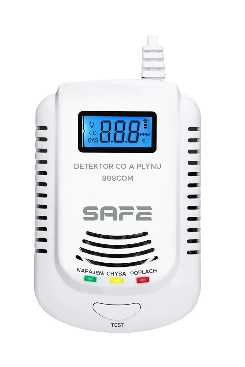 SAFE 808COM představuje hardwarově inovovanou verzi inteligentního kombinovaného detektoru vybaveného nejnovější technologií elektrochemického a polovodičového, multifunkčního senzoru druhé generace pro detekci a včasné varování před výskytem oxidu uhelnatého (CO) a takřka všech hořlavých, výbušných plynů (zemní plyn, metan, propan, butan). Zařízení vyniká stabilitou, vysokou citlivostí a dlouhou životností dvojice senzorů.Ideálně se hodí pro spolehlivou detekci úniku plynu nebo oxidu uhelnatého ze všech domácích plynových spotřebičů a plynových kotlů. Detekuje všechny hořlavé plyny běžně se vyskytující v domácnostech.