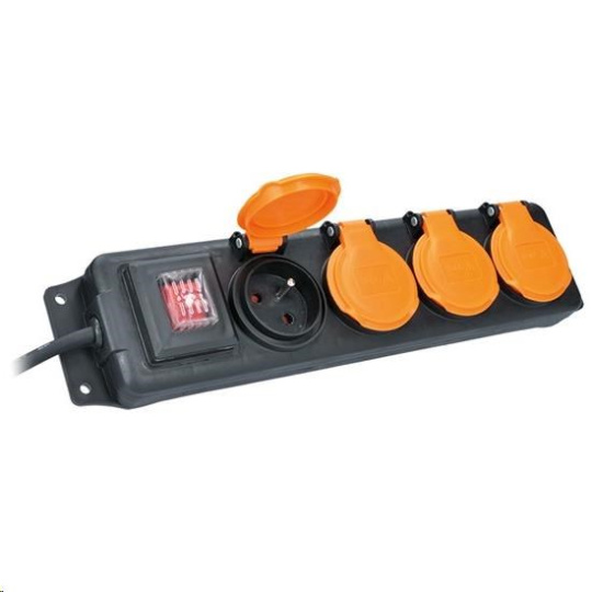 Solight prodlužovací přívod IP44, 4 zásuvky, gumový kabel, vypínač, venkovní, ,5m