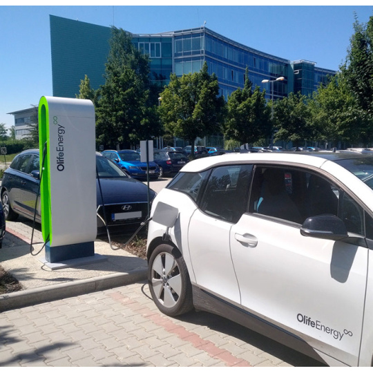 Olife Energy AC stojanová dobíjecí stanice pro elektromobily umožňuje nabíjení střídavým proudem. Součástí jsou dva kabely se zástrčkami (Mennekes). Velkým plusem stanice je, že dokáže nabíjet dva elektromobily zároveň, každý příkonem až 22 kW.
