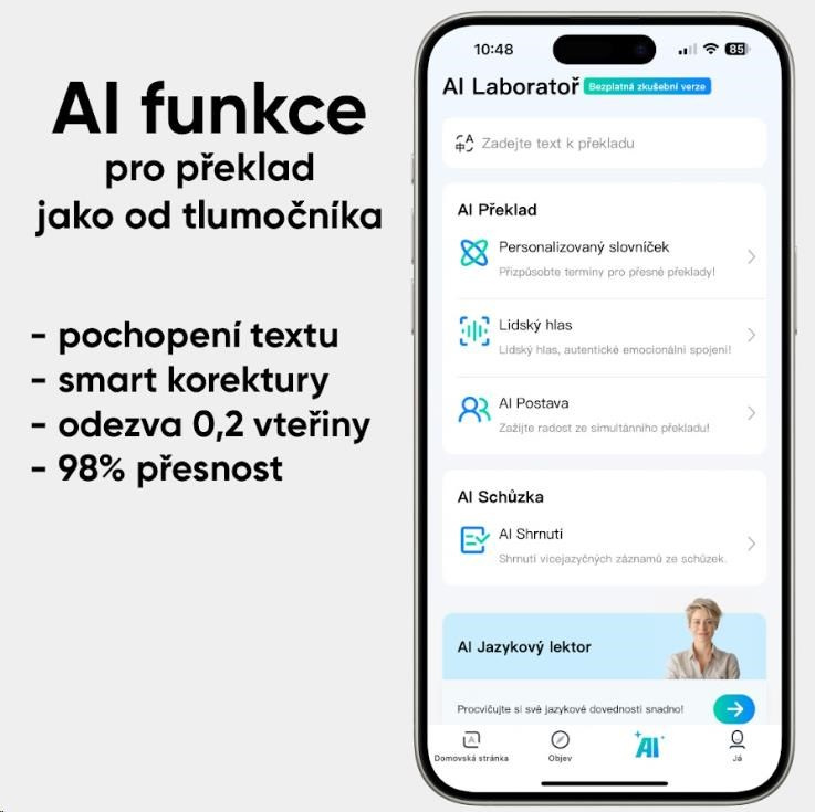 Zajistěte plynulý dialog bez zdlouhavého čekání na překlad - AI asistent v aplikaci vám vytvoří přepis a sumarizaci konverzace