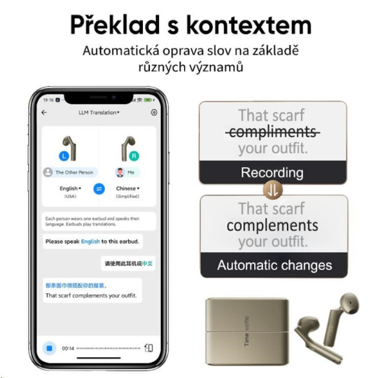 Překonejte jazykové bariéry v reálném čase s AI tlumočníkem a překladatelem Timekettle W4. Podporuje obousměrný překlad ve 42 jazycích a 95 dialektech, takže konverzace mezi různými kulturami je plynulá a přirozená. Ať už cestujete, pracujete nebo poznáváte nové lidi, W4 zajistí, že každé slovo bude správně pochopeno. Rozlučte se s trapnými pauzami a jazykovými nedorozuměními – stačí mluvit a AI se postará o zbytek. Komunikujte svobodně a sebevědomě kdekoliv na světě bez jazykových omezení. Přesnost překladu je až 98% a AI slovník na principu velkých jazykových modelů (LLM) zajistí díky perfektnímu porozumění přesnou opravu podobně znějících slov a celkovému porozumění kontextu konverzace. Aplikace Timekettle vám navíc z konverzací vytvoří přepis a AI shrnutí.