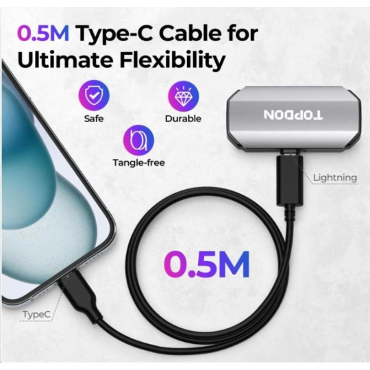 TOPDON kabel je vybavený adaptérem pro připojení zařízení s koncovkou Lightning na USB-C. Umožní vám snadno propojit TC002 s iPhonem nebo iPadem, které jsou vybaveny Type-C rozhraním.