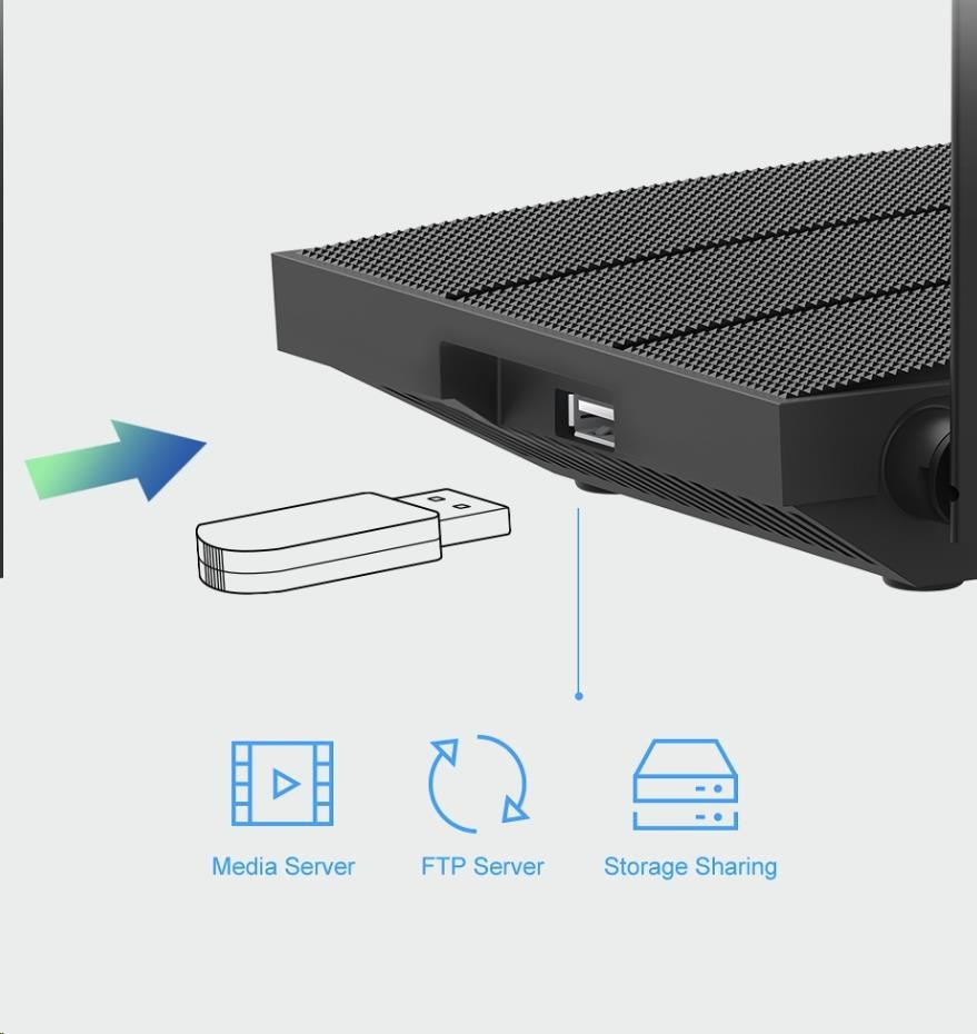 - USB port pro připojení flash disku či HDD (media server, storage sharing, FTP server)