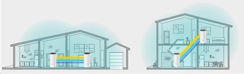 - Díky pokročilé Deco síťové technologii jednotky spolupracují na vytvoření jednotné sítě s jediným názvem sítě. Zařízení se automaticky přepíná mezi jednotkami Deco při vašem pohybu po domě pro dosažení nejvyšší možné rychlosti.