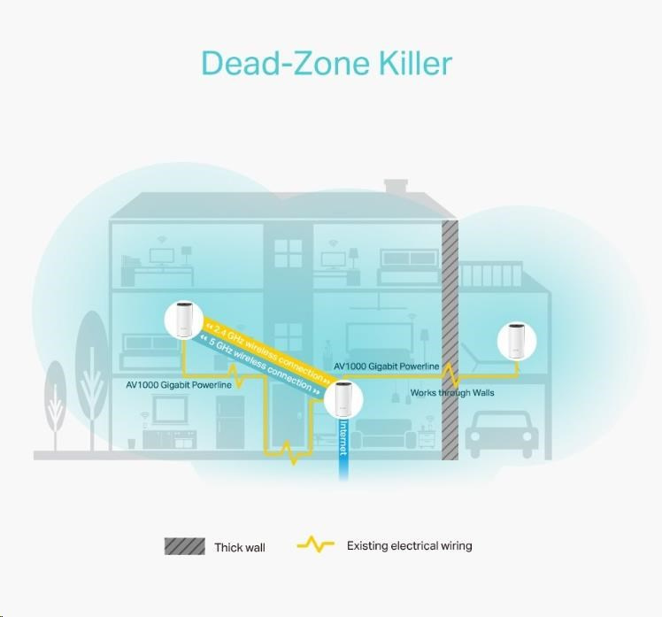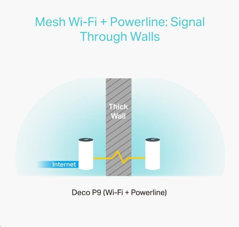 Deco P9 kombinuje duální Wi-Fi a powerline pro vytvoření silnější mesh sítě. Technologie Powerline využívá elektrické rozvody vašeho domu k vytvoření silnějšího propojení mezi jednotkami Deco tím, že snižuje dopad stěn a jiných překážek na signál a poskytuje ještě vyšší rychlosti sítě a skutečně bezproblémové pokrytí .