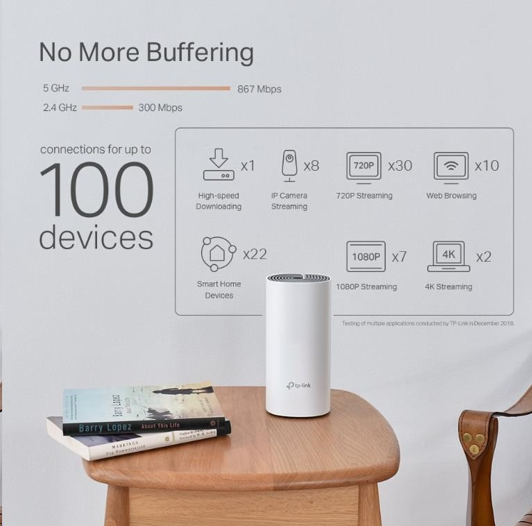 | WiFi Range | 4-6 Bedroom Houses (3-pack) TP-Link Mesh Technology Optional Ethernet backhaul work together to link Deco units to provide seamless coverage Powerline Technology Uses your home's electrical wiring to create stronger connections between Deco units, reducing the impact of walls or other obstacles on signal 2× Antennas (Internal) Multiple antennas form a signal-boosting array to cover more directions and large areas Beamforming Concentrates wireless signal strength towards clients to expand WiFi range |