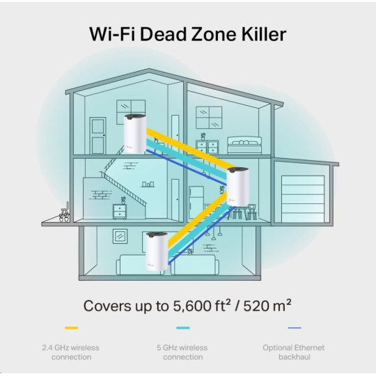 | WiFi Range | 3-5 Bedroom Houses (3-pack) TP-Link Mesh Technology Optional Ethernet backhaul works together to link Deco units to provide seamless coverage 3× Antennas (Internal) Multiple antennas form a signal-boosting array to cover more directions and large areas Beamforming Concentrates wireless signal strength towards clients to expand WiFi range |