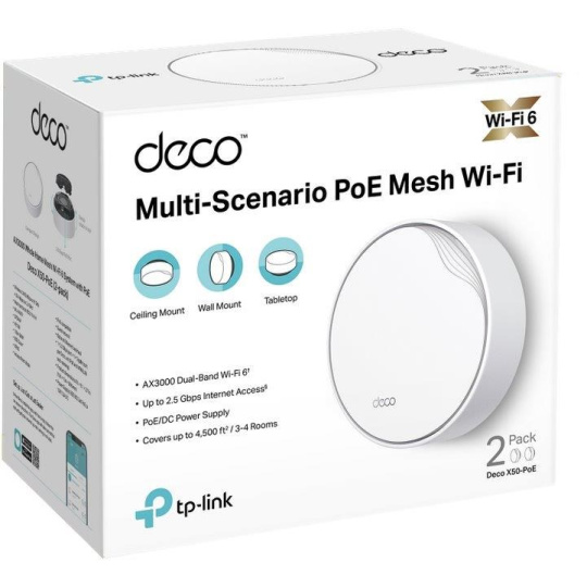 | Package Contents | Deco X50-PoE (1-pack) 1× Deco X50-PoE unit 1× RJ45 Ethernet cable 1× Power adapter Ceiling/Wall Mounting Kits Quick Installation Guide Deco X50-PoE (2-pack) 2× Deco X50-PoE units 1× RJ45 Ethernet cable 2× Power adapters Ceiling/Wall Mounting Kits Quick Installation Guide Deco X50-PoE (3-pack) 3× Deco X50-PoE units 1× RJ45 Ethernet cable 3× Power adapters Ceiling/Wall Mounting Kits Quick Installation Guide |