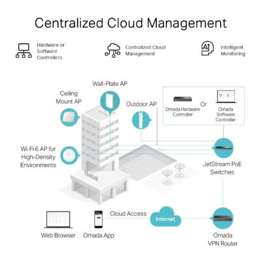 - Integrováno do platformy Omada SDN: Funkce ZTP (Zero-Touch Provisioning),** centralizovaná cloudová správa a inteligentní monitorování.