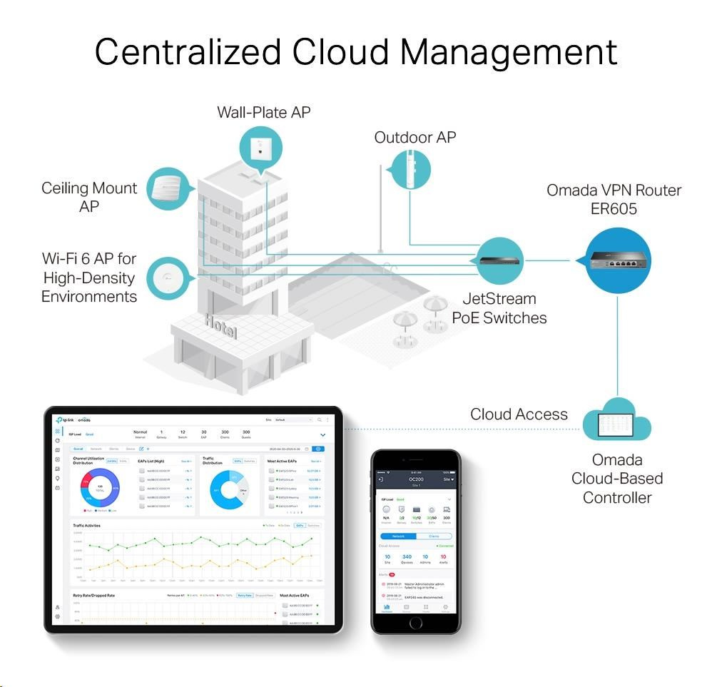 - Centralizovaná správa: Cloudový přístup a aplikace Omada pro maximální pohodlí a snadnou správu.