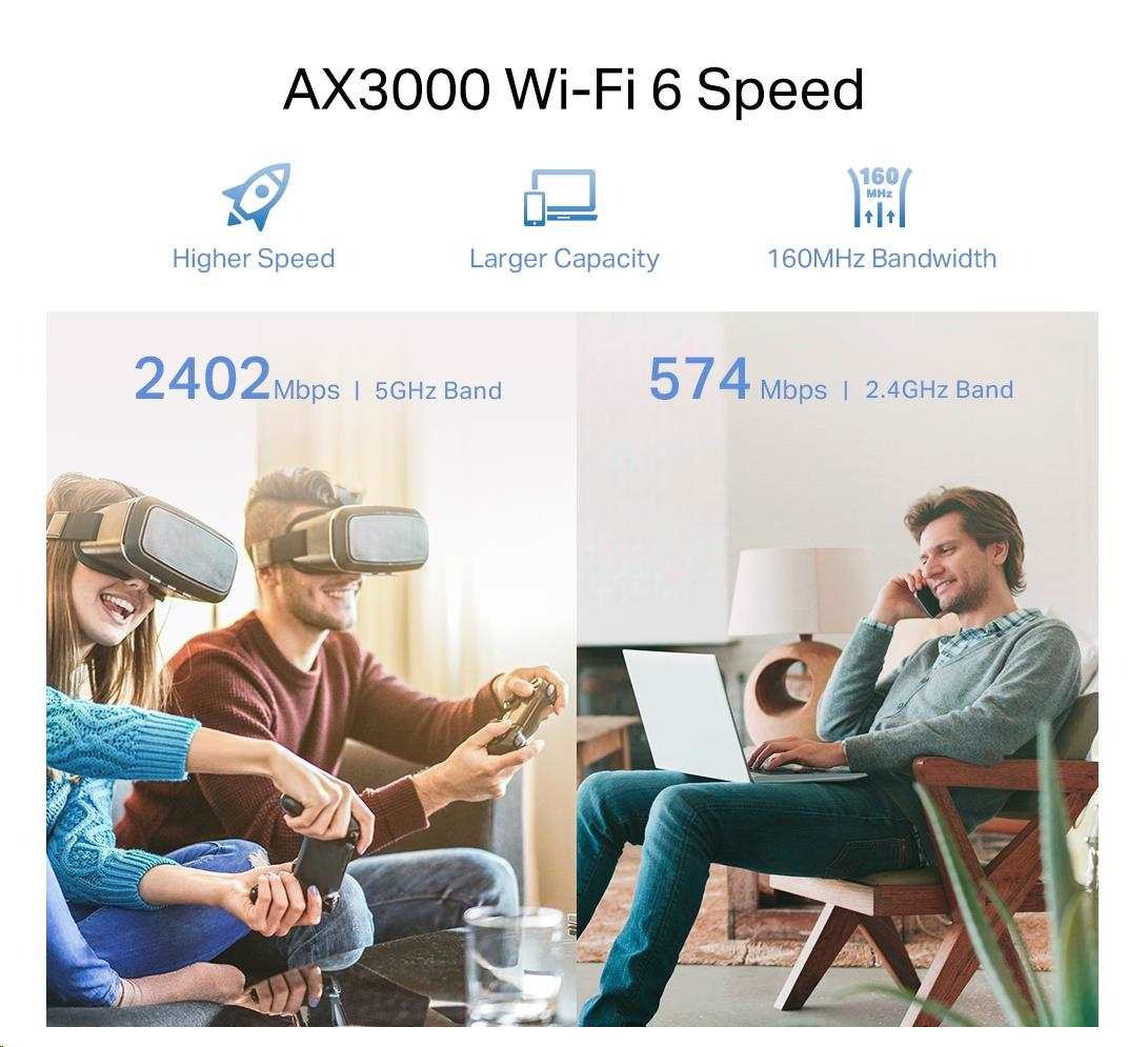 - Dvoupásmová síť Wi-Fi 6 - oddělená pásma 5 GHz (2 402 Mbit/s) a 2,4 GHz (574 Mbit/s) sítě Wi-Fi přinášejí díky nejnovějším technologiím vyšší rychlost a větší propustnost.
