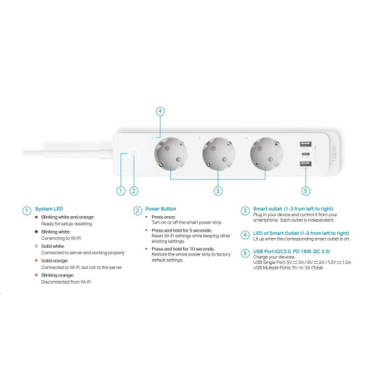 - Individuální kontrola – ovládejte samostatně 3 chytré zásuvky napájecí vícenásobné zásuvky prostřednictvím aplikace nebo hlasových příkazů.