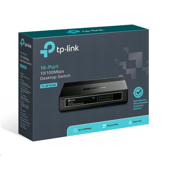 Switch TL-SF1016D Fast Ethernet je určen pro malé kanceláře nebo pracovní skupiny. Všech 16 portů podporuje funkci Auto MDI/MDIX, díky které se nemusíte starat o příslušný typ kabelu – stačí zapojit a používat. Navíc s inovativní technologií úspory energie dokáže zařízení TL-SF1016D snížit spotřebu energie až o 70 %*; 80 % obalového materiálu lze recyklovat. To vše z tohoto zařízení činí ekologické řešení pro vaši firemní síť.
