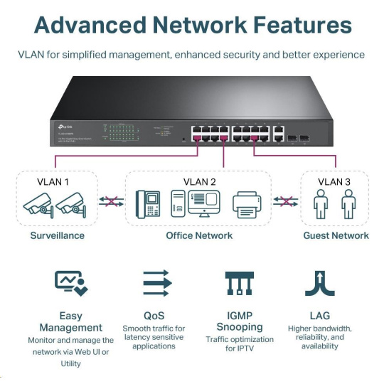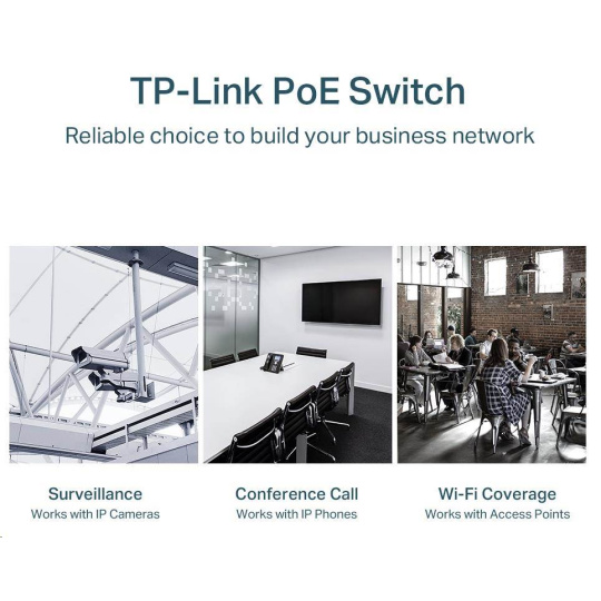 Vyhovuje standardu 802.3af/at PoE+, který podporuje až 30 W na každém portu PoE. Celkový rozpočet napájení 250 W PoE pro 16 gigabitových portů PoE+ umožňuje široké možnosti využití, například pro dohledové systémy pro kanceláře, studentské koleje a malé firmy. Je plně kompatibilní s IP kamerami, přístupovými body, IP telefony, počítači, tiskárnami a dalšími zařízeními.
