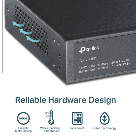 TP-Link switch TL-SL1218P, 16x PoE+ 10/100Mb/s RJ45, 2xGbE RJ45, 2x Fan