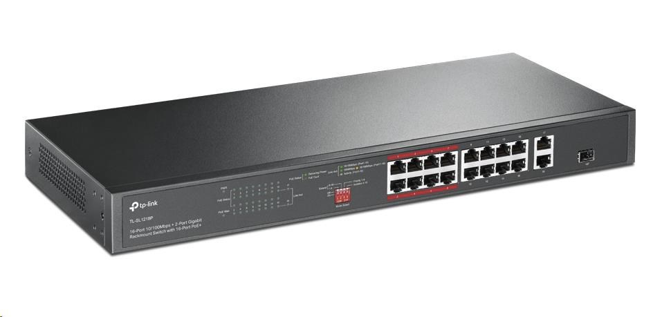 TP-Link switch TL-SL1218P, 16x PoE+ 10/100Mb/s RJ45, 2xGbE RJ45, 2x Fan