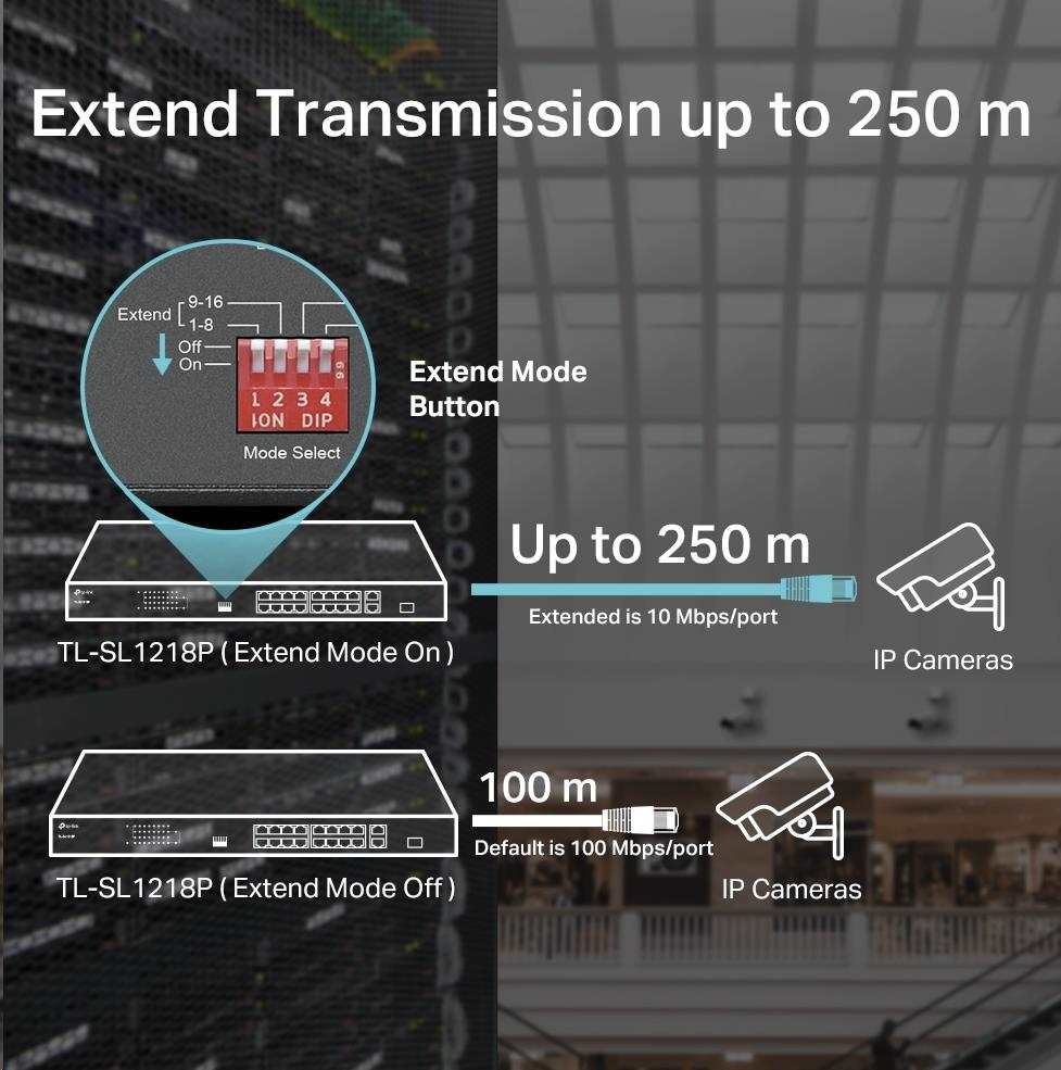 - Přenos dat a napájení až do vzdálenosti 250 m v režimu prodloužení speciálně navrženého pro dohledový systém.