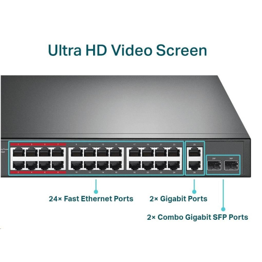 | Interface | 24× PoE+ 10/100 Mbps RJ45 Ports 2× 10/100/1000 Mbps RJ45 Ports 2× Combo Gigabit SFP Slots |