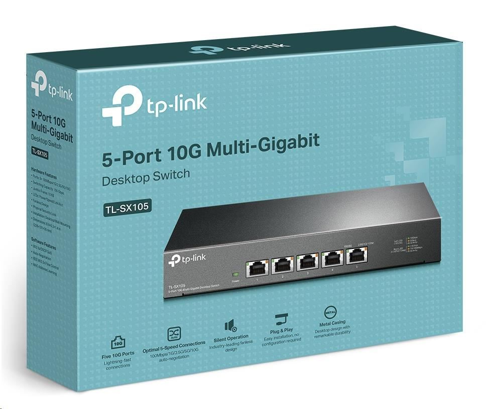 Switch TL-SX105, který je vlajkovým produktem segmentu 10G, je 5portový stolní switch 10G s kapacitou přepínání až 100 Gbit/s. Funkce automatického vyjednávání rychlostí 5rychlostního připojení (100 Mbit/s / 1G / 2.5G / 5G / 10G) monitoruje rychlost připojení a inteligentně ji přizpůsobuje pro kompatibilitu a optimální výkon všech vašich zařízení, včetně úložišť NAS 10G, serverů 10G, pracovních stanic, herních počítačů, přístupových bodů 2.5G / 5G / 10G WiFi 6, 8K videí, stolních počítačů a dalších aplikací.