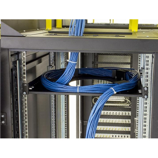 Držák je možno instalovat ve svislé poloze (10U) na 19“ vertikální lišty (obvykle na zadní stranu rozvaděče), nebo po otočení úchytů vodorovně mezi vertikály podobně jako klasickou polici. Nosné trny namontované kolem středového otvoru zajišťují poloměr ohybu uložených kabelů a brání jejich poškození.
