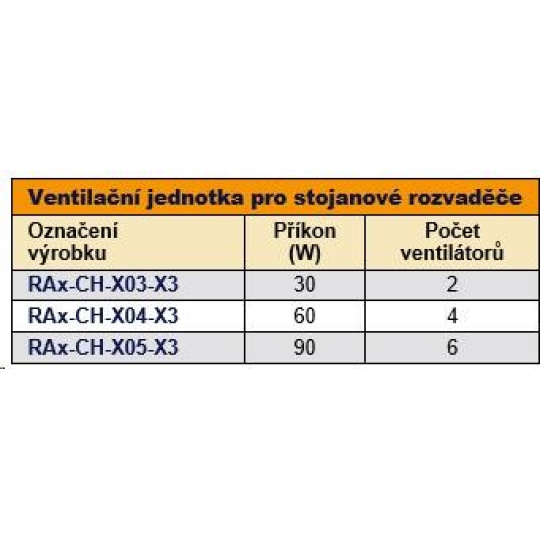 Ventilační jednotka pro stojanové rozvaděče – do čepice se instaluje z venkovní strany rozvaděče, do základny pak z vnitřní strany rozvaděče. Při instalaci do základny rozvaděče je nutno použít montážní rám spodní ventilační jednotky – RAx-CH-Xxx-X1, který se instaluje pomocí oboustranné lepící pásky.