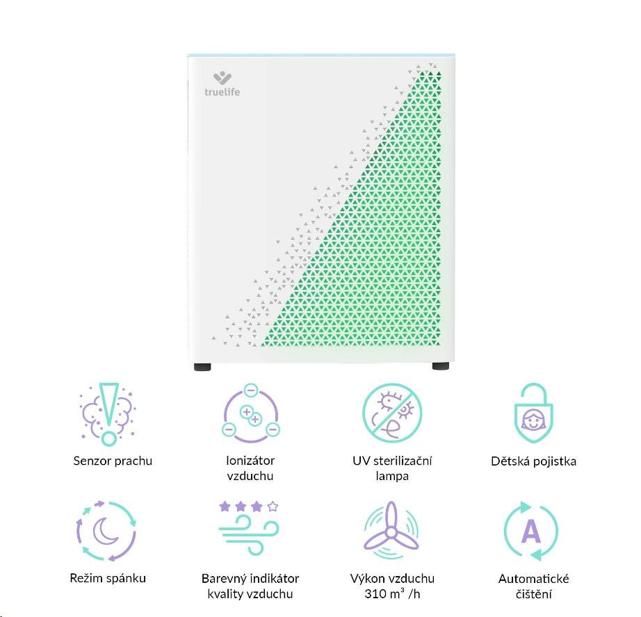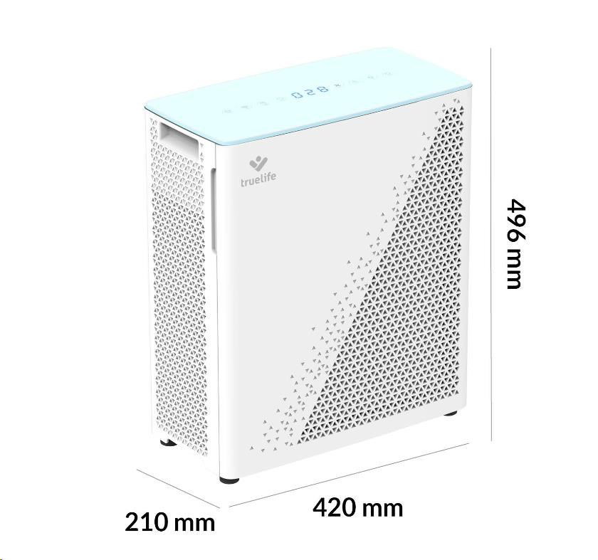 Čistička vzduchu TrueLife vyčistí až 310 m3 vzduchu za hodinu. Je vhodná do místnosti o velikosti 35-40 m2, můžete jí bez obav přenášet. Čistička celkově zlepšuje kvalitu vzduchu, ničí viry, bakterie a další nečistoty a může tak významně pomoci alergikům nebo astmatikům. Čistička je opatřena barevnými indikátory kvality vzduchu, funkcí automatické detekce nečistot a automatického čištění. Bydlíte-li na místě, kde se často práší, potěší vás přítomnost prachového senzoru. 7 násobná filtrace v podobě předfiltru, anti-bakteriálního filtru, HEPA filtru, uhlíkového filtru, katalytického filtru, UV světla a ionizace zachytí až 99,9% polétavého prachu a vyčistí 93,5 % těkavých organických látek. Zároveň zachycuje i viry a koronaviry.