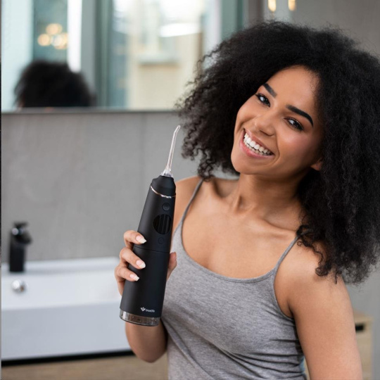 Naprostá většina zubních kazů vzniká v mezizubních prostorech. Jejich pravidelné čištění je proto nutností. Bývá ale zdlouhavé a často ne úplně příjemné. S ústní sprchou TrueLife AquaFloss Compact C300 je čištění mezizubních prostor o mnoho snazší a šetrnější. Díky technologii StreamTrue® proud kapek vody a vzduchu, který vychází z trysky ústní sprchy, dokonale pronikne i do nejmenších prostor, kde účinně odstraňuje až 99 % zubního plaku i bakterií. Díky kompaktnímu designu a výdrži baterie můžete se sprchou bez obav cestovat. Její používání je snadné a vyžaduje minimum nácviku. Sprcha nabízí 5 režimů čištění s různými intenzitami tlaku, včetně režimu Pulse s technologií PulseTrue®, díky které přístroj masíruje dásně, prokrvuje je a napomáhá tak jejich regeneraci. Díky funkci DIY si můžete vytvořit vlastní režim čištění, ve kterém si zvolíte intenzitu tlaku vody, která vám bude nejvíce vyhovovat. Přístroj má 6 speciálních trysek, které jsou navrženy pro vaše konkrétní potřeby.