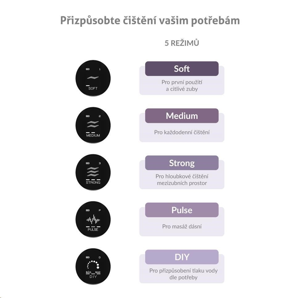 U AquaFloss Compact C300 máte na výběr z pěti čistících režimů, díky kterým si čištění zubů plně přizpůsobíte. Do nádržky o kapacitě 300 ml můžete kromě vody nalít i ústní vodu pro extra porci svěžesti a hygieny. Tryska sprchy je otočná o 360 stupňů a dostane se i do těch nejmenších mezizubních prostor, odkud odstraní až 99 % zubního plaku. Spolu se sonickým kartáčkem snižuje riziko vzniku zubního kazu i zánětu dásní a ušetří vás nepříjemných návštěv stomatologa i nečekaných výdajů.