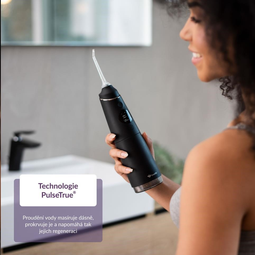 Naprostá většina zubních kazů vzniká v mezizubních prostorech. Jejich pravidelné čištění je proto nutností. Bývá ale zdlouhavé a často ne úplně příjemné. S ústní sprchou TrueLife AquaFloss Compact C300 je čištění mezizubních prostor o mnoho snazší a šetrnější. Díky technologii StreamTrue® proud kapek vody a vzduchu, který vychází z trysky ústní sprchy, dokonale pronikne i do nejmenších prostor, kde účinně odstraňuje až 99 % zubního plaku i bakterií. Díky kompaktnímu designu a výdrži baterie můžete se sprchou bez obav cestovat. Její používání je snadné a vyžaduje minimum nácviku. Sprcha nabízí 5 režimů čištění s různými intenzitami tlaku, včetně režimu Pulse s technologií PulseTrue®, díky které přístroj masíruje dásně, prokrvuje je a napomáhá tak jejich regeneraci. Díky funkci DIY si můžete vytvořit vlastní režim čištění, ve kterém si zvolíte intenzitu tlaku vody, která vám bude nejvíce vyhovovat. Přístroj má 6 speciálních trysek, které jsou navrženy pro vaše konkrétní potřeby.