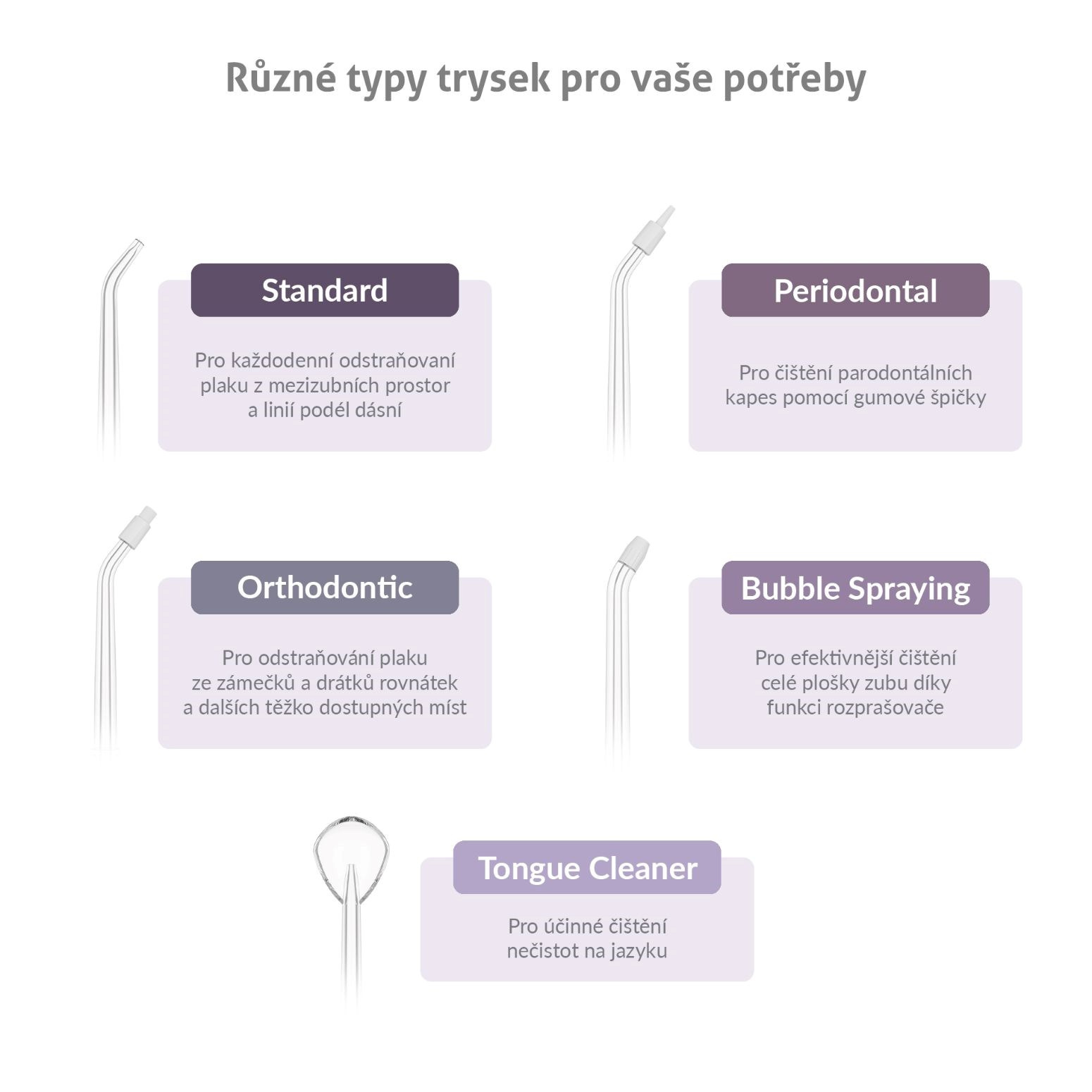 Součástí balení ústní sprchy je 6 různých druhů trysek M-series, takže ji může využívat celá rodina. Další trysky pro různé dentální potřeby lze dokoupit.