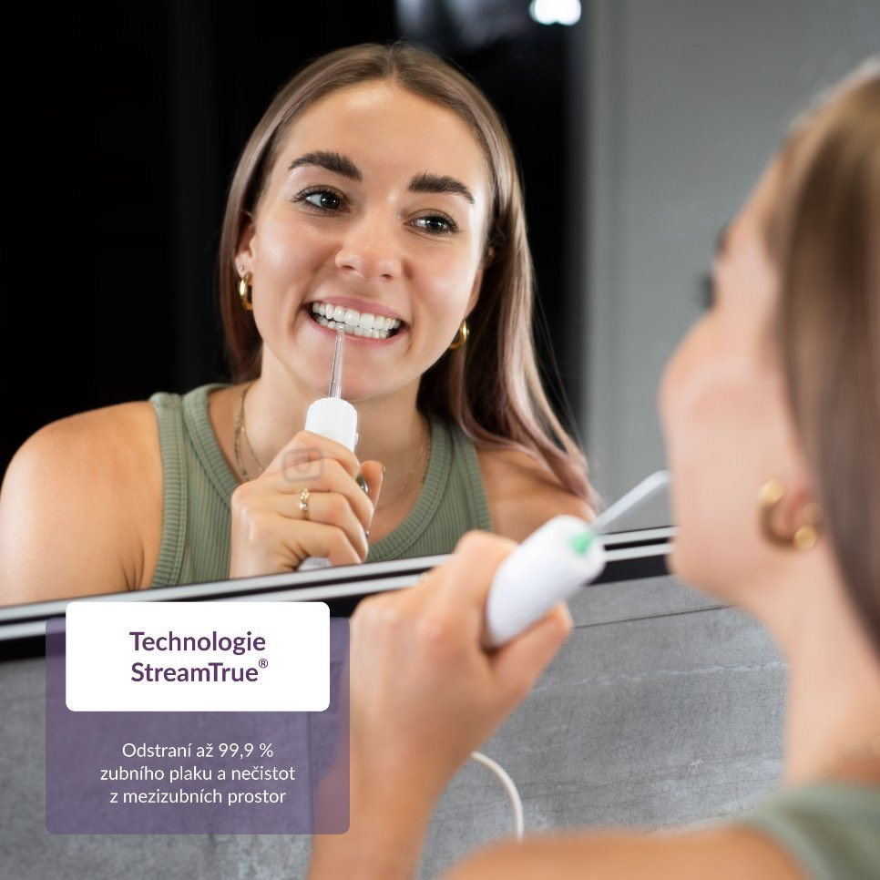Asi vás nepřekvapí, že zubním kartáčkem vyčistíte přední a zadní strany zubů, ale mezi zuby se s ním nedostanete. 95% zubních kazů přitom vzniká právě tam. Zařadíte-li do své dentální rutiny i čištění mezizubních prostor, můžete předejít nejen zubnímu kazu, ale i zánětu dásní nebo paradontóze. Ústní sprcha TrueLife AquaFloss Station O300 Ozone slouží ke každodennímu efektivnímu čištění mezizubních prostor, které je snazší a šetrnější, než při použití mezizubních kartáčků či nití. Sprcha nabízí 10 úrovní tlaku a díky technologii StreamTrue® odstraní až 99 % zubního plaku a vyčistí vaše zuby tak, jak to samotný kartáček nikdy nedokáže. Sprcha disponuje také technologií OzoneTrue®, díky které dochází ke sterilizaci vody díky ozonu. Přístroj má 6 speciálních trysek, které jsou navrženy pro vaše konkrétní potřeby.