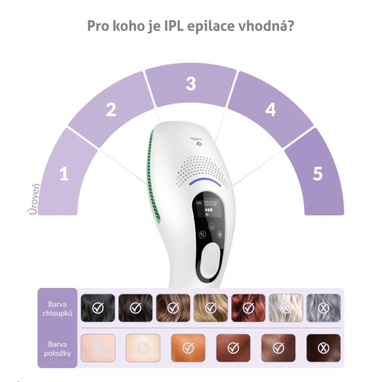 Pomocí ovládacího tlačítka si sami zvolíte požadovanou úroveň světla, která odpovídá vašemu typu pokožky.
