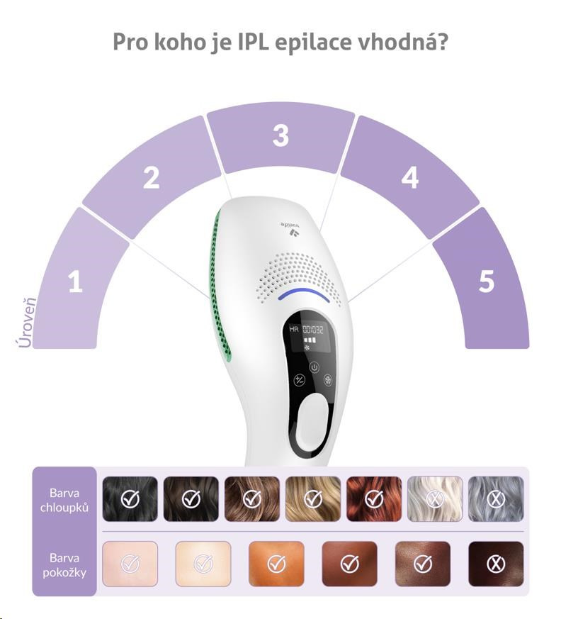 Pomocí ovládacího tlačítka si sami zvolíte požadovanou úroveň světla, která odpovídá vašemu typu pokožky.