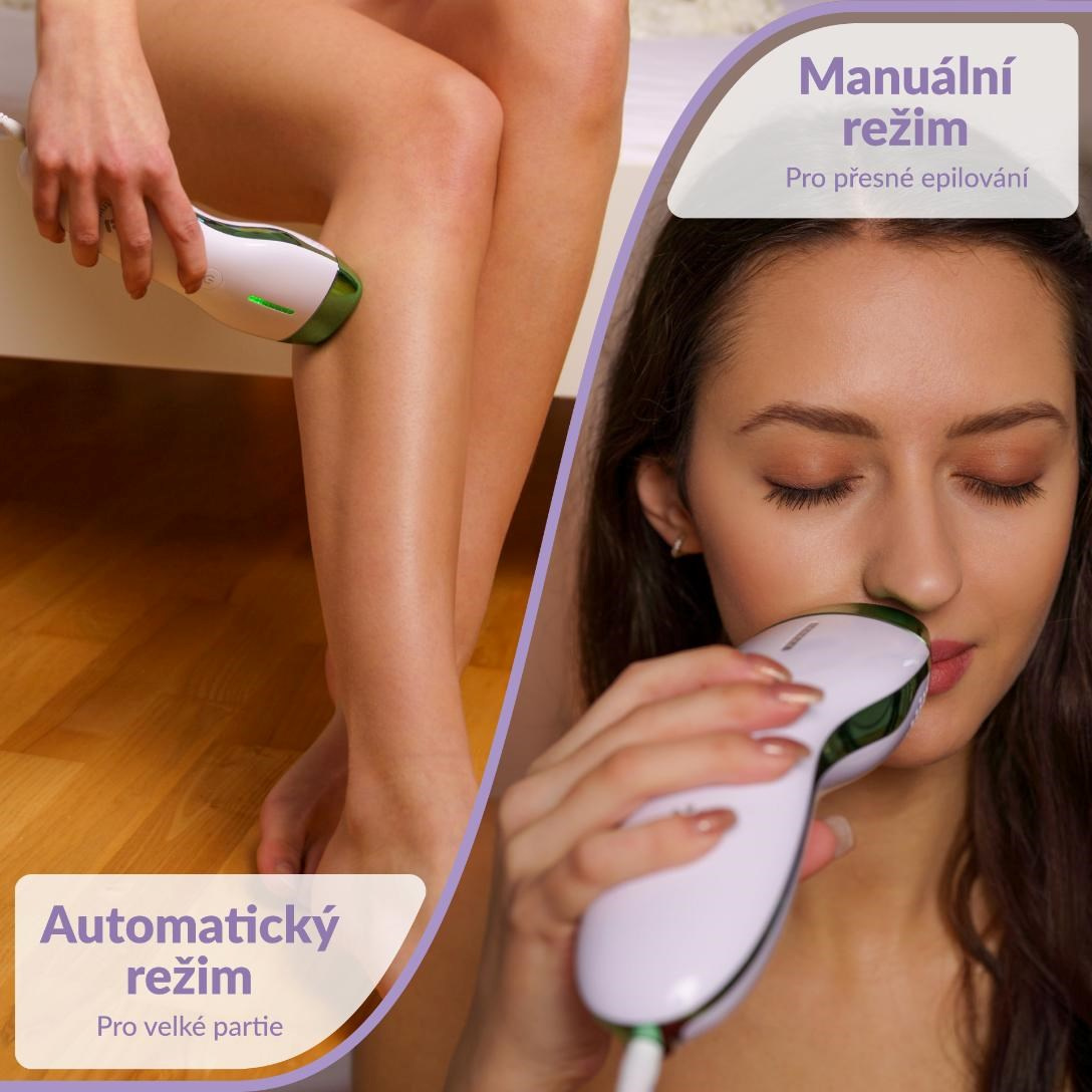 Epilátor TrueLife BELLE IPL EB3 nabízí dva režimy. Manuální režim jednotlivých záblesků je vhodný k epilaci malých a těžko dostupných oblastí, jako jsou obličej, podpaží, oblast bikin nebo kotníky. S automatickým režimem rychle a pohodlně ošetříte větší oblasti, například nohy. Jakmile se přístroj dotkne epilované oblasti, jednoduše podržíte tlačítko ovládání po dobu 3 sekund, epilátor se přepne do automatického režimu, kdy při plynulém pohybu po pokožce bude neustále vydávat záblesky.