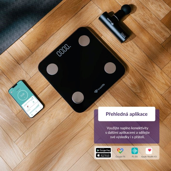 Chytrá váha TrueLife FitScale W1 BT Black měří pomocí bioelektrické impedanční analýzy (BIA) celkovou tělesnou kompozici, díky čemuž zjistíte kromě hmotnosti i další informace jako poměr svalové hmoty, tuku, vody. Celkově je k dispozici 20 měřitelných indexů, jejichž vysvětlení najdete v aplikaci Fitdays, která poskytuje kompletní a přehledný report o stavu vašeho zdraví a kondice, zároveň navrhuje cesty ke zlepšení. Propojení váhy s aplikací probíhá přes Bluetooth a data se poté automaticky synchronizují.