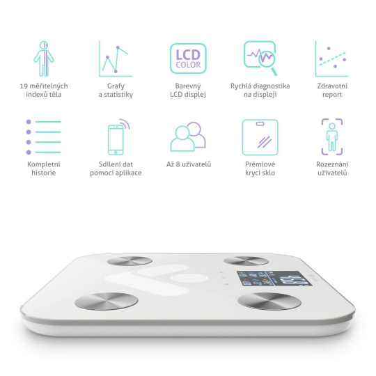 Inteligentní váha FitScale W7 BT automaticky rozpozná až 8 uživatelů, můžete si tak porovnávat výsledky celé rodiny. Jakmile si stáhnete aplikaci, která je kompletně v češtině, půjde to ještě snadněji. Kromě získání kompletního reportingu pro každého z uživatelů, lze údaje porovnávat či sledovat statistiky a vývoj na grafech. Aplikace je kompatibilní s Apple Health Kit, Fitbit a Google Fit a přináší rovněž detailní popis všech měřených indexů. Šikovná je i možnost nastavení notifikací a připomínek vážení, oceníte jistě možnost nastavení pro vážení dětí.
