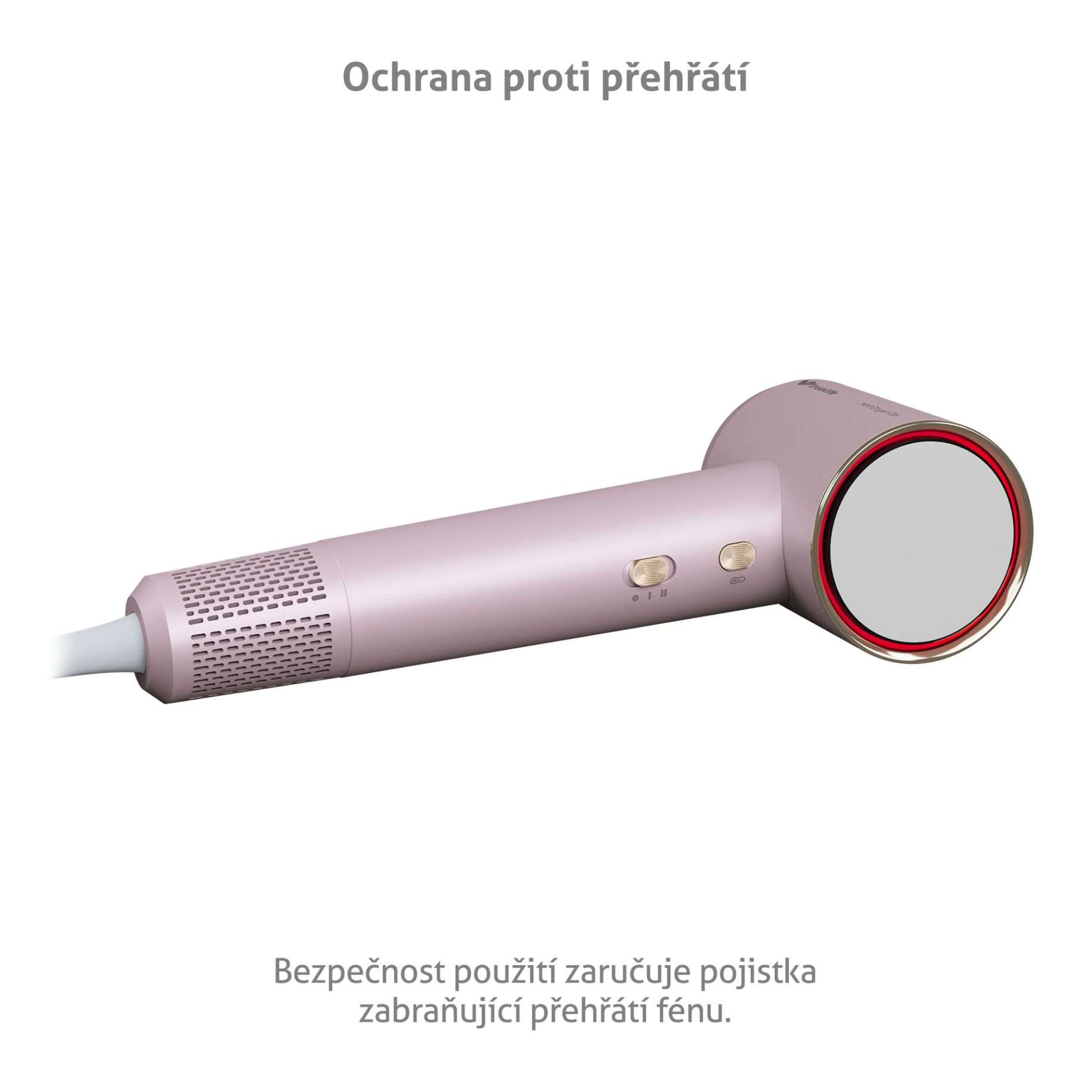 Součástí balení fénu je také magnetický koncentrační nástavec pro cílené vysoušení, fixaci a styling. Pomocí magnetu jej snadno nainstalujete a stejně jednoduchá je i údržba fénu, kdy stačí odšroubovat prachový filtr ve spodní části přístroje a očistit. Oproti běžným fénům je tento až o 50 % tišší, a tedy příjemnější na používání. Komfortní užití zajišťuje také dostatečně dlouhý přívodní kabel, 1,8 m umožňuje volnost pohybu. Postaráno je i o bezpečnost, kterou má na starosti ochrana proti přehřátí.
