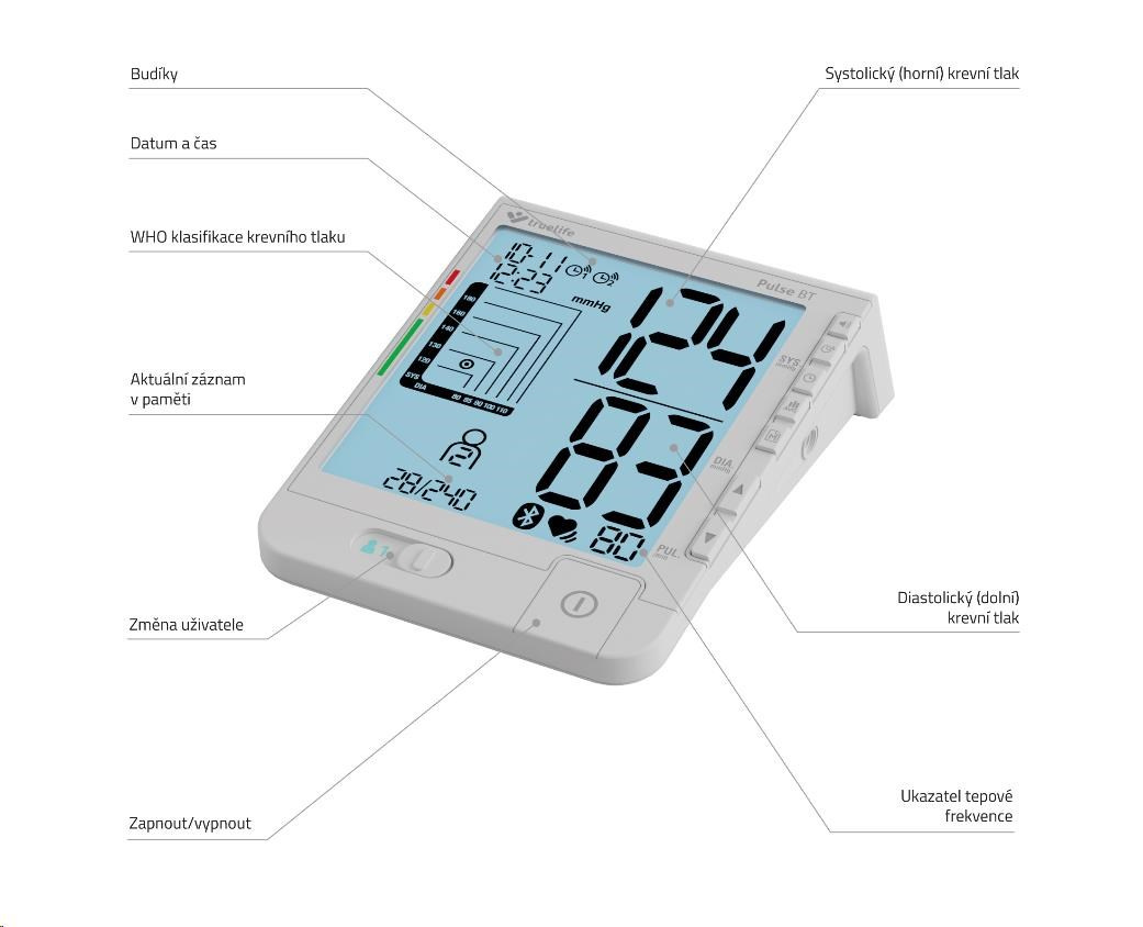 Tlakoměr TrueLife Pulse BT využívá oscilometrickou metodu měření tlaku, které zajišťuje maximální přesnost naměřených hodnot. Tlakoměr mohou využívat dva uživatelé. Potřebujete-li si hodnoty tlaku hlídat a zaznamenávat, potěší vás paměť až na 480 měření pro každého uživatele. Případně je možné připojit tlakoměr k telefonu pomocí Bluetooth. Díky propojení s mobilní aplikací máte přehledně zpracovanou historii vašich výsledku nejen pro vašeho lékaře, ale i např. pro vaše blízké. Indikátor nepravidelného srdečního rytmu hlídá váš puls.