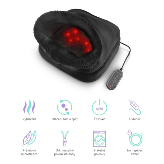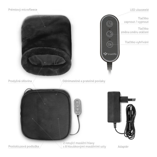 Nosí nás každý den a my jim věnujeme zpravidla velmi malou pozornost, dokud nezačnou bolet. Řeč je o našich nohách. TrueLife RelaxFeet F3 představuje řešení, jež uvolní chodidla, prsty a spodní paty, čímž napomáhá od problémů se studenými nohami či potížemi spojenými s dlouhodobým stáním. Dvě rotující masážní hlavice s osmi nahřívacími masážními uzly zajistí příjemnou masáž napomáhající úlevě od chronických bolestí, stresu a dalších neduhů. Rotace hlavic lze zvolit jedním nebo druhým směrem, přičemž masáž trvá 15 minut. Po jejich uplynutí se přístroj automaticky vypne díky časovači. Celkový komfort masáže zlepší možnost vyhřívání, kterého však jde využít i samostatně bez masírování. Díky integrovanému zipu lze odejmout vrchní část a přístroj použít i pro masáž zad. Povlak je vyroben z příjemného microfleecu a lze ho vyprat v pračce.