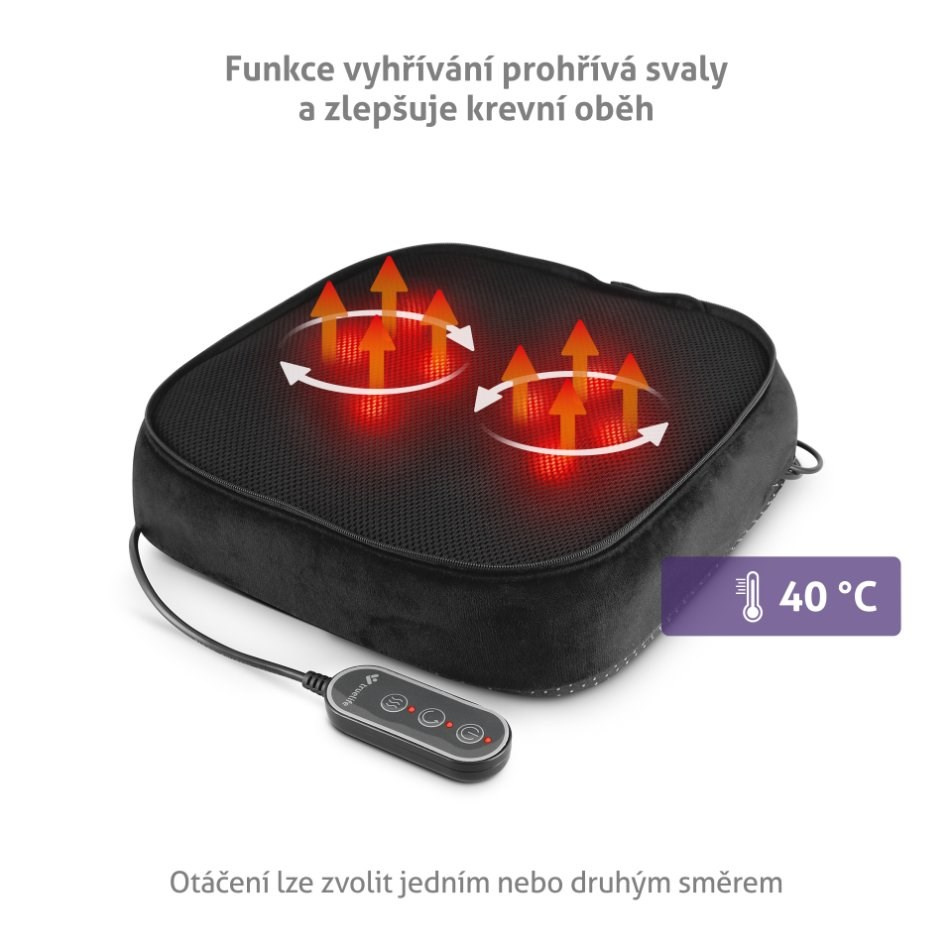 Přístroj je vybaven ovladačem s intuitivním ovládáním jednotlivých funkcí, díky kterému lze zvolit kombinaci masáže s vyhříváním či samostatně a otáčení hlavic jedním nebo druhým směrem. Protiskluzová podložka zajištuje, že přístroj zůstane na svém místě a jediné, co se otáčí, jsou dvě rotační hlavice s osmi nahřívacími masážními uzly. Masáž trvá ideálních 15 minut, po jejichž uplynutí časovač přístroj automaticky vypne. Údržbu vrchního a spodního microfleecového povlaku zjednodušuje možnost sundání a praní v pračce.