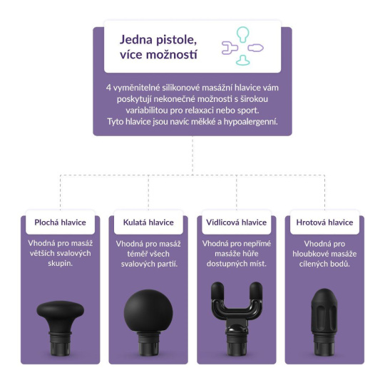 RelaxGun G6 Metal disponuje hned 4 vyměnitelnými silikonovými hlavicemi, určenými na různé části těla a pro široké využití. Měkké, silikonové a hypoalergenní provedení je oproti tomu běžnému plastovému šetrné k pokožce, odolné a dobře se udržuje. Pro masáž větších svalových skupin se hodí plochá hlavice Flat Head, jejíž tlak je jemnější, což oceníte například v blízkosti kostí. Obtížně dostupná místa jako trapézy či achillovu šlachu promasíruje hlavice Fork Head, která se snadno přizpůsobí konturám těla. Téměř pro všechny svalové partie se hodí kulatá hlavice Ball Head, jež se tělu dokonale přizpůsobí. Pro cílenou masáž konkrétních bodů na těle, tzv. trigger pointů, je určena hrotová hlavice Bullet Head.