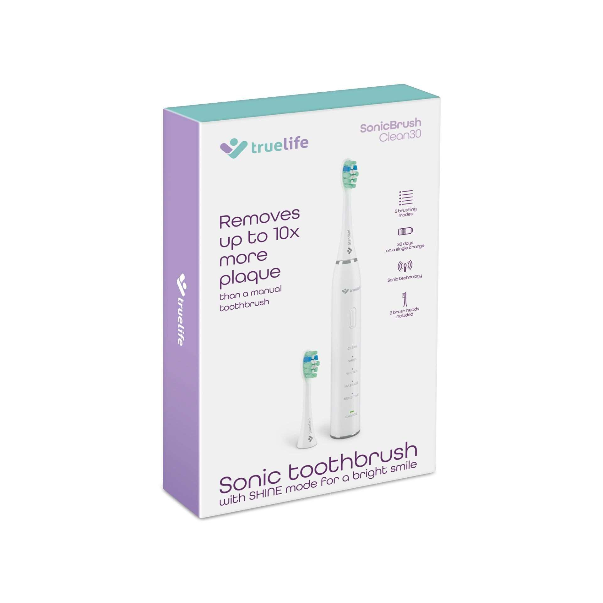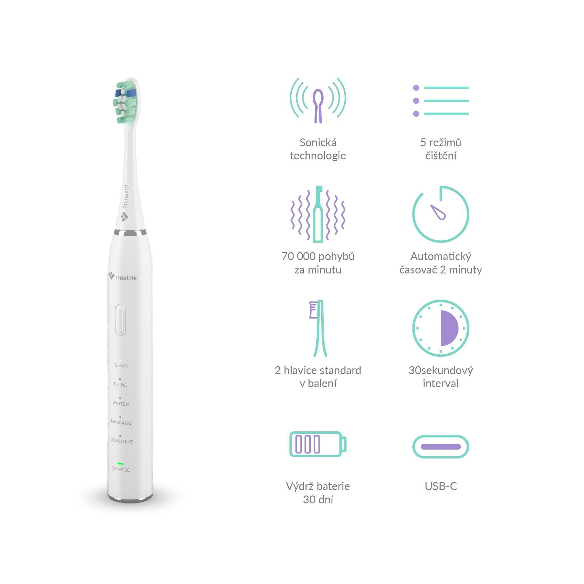 Krásný úsměv začíná správnou každodenní péčí o zuby. Skvělým cenově dostupným a výkonným pomocníkem je sonický kartáček TrueLife SonicBrush Clean30 se sonickou technologií SonicTrue®. Jeho 70 000 pohybů za minutu zuby dokonale vyčistí a jde i dál díky možnosti výběru z 5 režimů čištění. Clean vyčistí zuby a odstraní zubní plak, Shine zbaví zuby skvrn od čaje a kávy, k vybělení slouží režim Whiten, dásním udělá dobře Massage a pro citlivé zuby a dásně je určen režim Sensitive. Balení obsahuje 2 hlavice Standard, jejichž modré štětinky zhruba po třech měsících zbělají. Tím indikují, že je potřeba hlavici vyměnit. Na jedno nabití vydrží kartáček 30 dní, pak ho jen stačí dobít pomocí přiloženého USB-C kabelu.